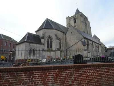 Le centre d'Acquin est marqué par cette immense muraille de pierre assise sur un solin de silex, qui dresse sa tour face à l'église.